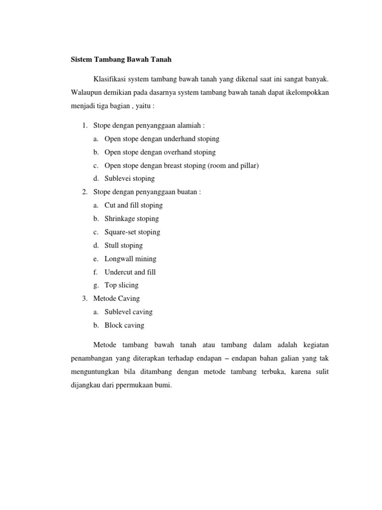 Dimana segala kegiatan atau aktivitas penambangan dilakukan di atas atau relatif dekat permukaan bumi dan tempat kerja berhubungan langsung dengan udara luar. Secara umum pengertian tambang bawah tanah adalah suatu sistem penambangan mineral atau batu bara dimana seluruh aktivitas penambangan tidak berhubungan langsung dengan alam terbuka. Download makalah tambang bawah tanah comments. Open stope methodes supported stope methodes caving methodes coal mining methodes 3. Untuk sr yang lebih tinggi